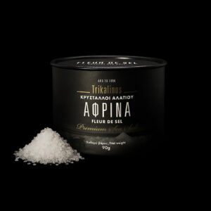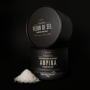 Trikalinos Afrina – FLEUR DE SEL is obtained solely by traditional harvesting methods. It is 100% natural salt which is not altered in any way. Fresh, bright, white salt always remains slightly moist.